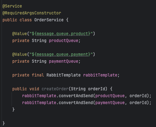 - Order Service에서는 메시지를 큐로 전송하는 역할을 하는 convertAndSend() 메서드를 사용하여 두 개의 큐(productQueue와 paymentQueue)에 메시지를 보내는 createOrder메서드입니다.