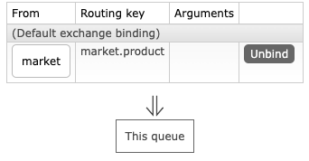 - 바인딩할 때 queueProduct 라우팅 키를 사용합니다. 본 글에서는 큐의 이름과 동일(market.product)하게 지정했습니다.