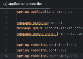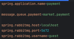 - application.properties 또는 application.yml 파일에서 message.queue.payment 속성의 값을 주입받습니다. 이 값은 RabbitMQ의 결제 큐 이름을 나타냅니다.