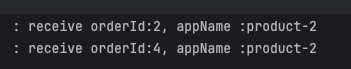 마찬가지로 Product 애플리케이션을 실행하면 market.product 큐에 적재되어 있던 메시지를 Product 애플리케이션의 Listener가 읽어 처리합니다. 이로 인해 로그에 메시지가 출력된 것을 확인할 수 있습니다.