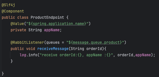 - application.properties 또는 application.yml 파일에서 message.queue.product 속성의 값을 주입받습니다.