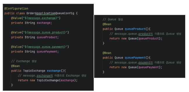 Queue Config를 통해 RabbitMQ의 큐와 교환기(Exchange)를 생성하고, 이들 간의 연결을 설정합니다.