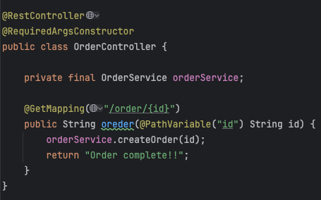 - 이 메서드는 orderService.createOrder(id)를 호출하여 주문을 생성하고, 문자열 "Order complete!!"를 응답으로 반환합니다.