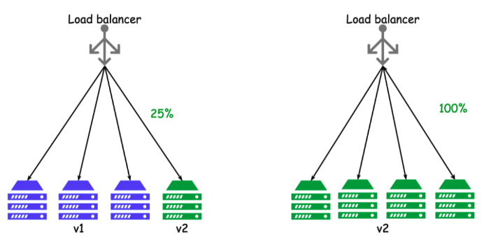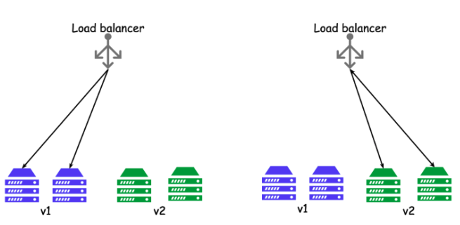 이 방식에서는 시스템의 일부 인스턴스에서 새로운 버전이 실행되며, 나머지 인스턴스는 기존 버전을 계속 실행합니다.