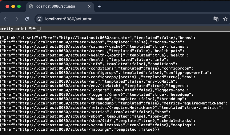 포트를 8080으로 지정했기 때문에 localhost:8080/actuator로 접속해 보면 위와 같이 다양한 엔드포인트가 있습니다.