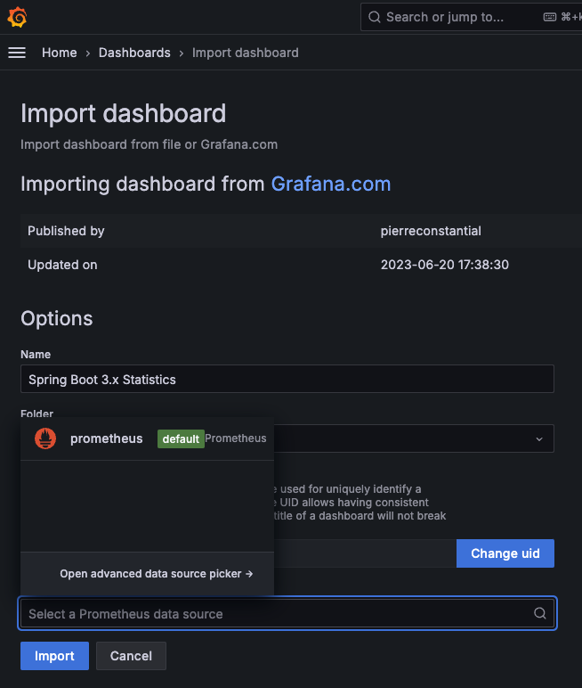 Load를 클릭하면 위와 같이 나오고, 좀 전에 등록한 Prometheus를 등록해주고 import해줍니다.