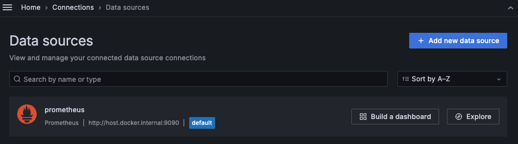 Sava & test를 클릭한 후, 'Data Sources' 탭으로 이동하면 Grafana에서 Prometheus 데이터 소스가 정상적으로 등록된 것을 확인할 수 있습니다.