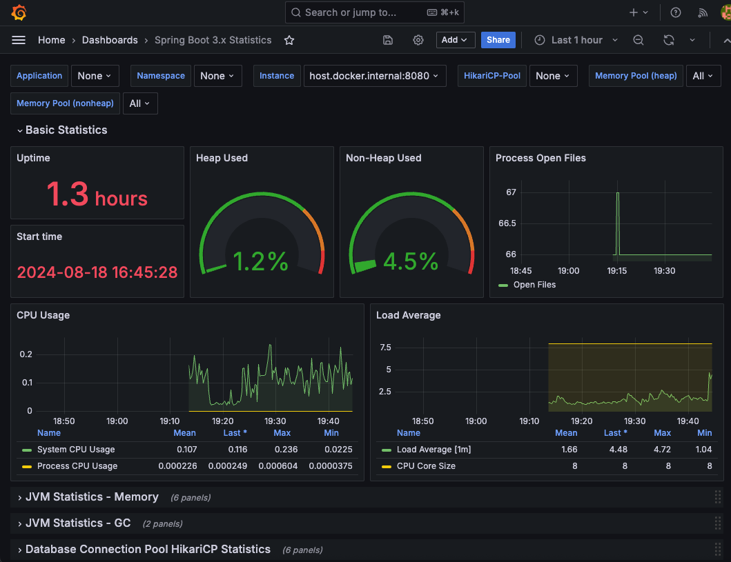 이 대시보드는 이전에 설정한 8080 포트에서 실행 중인 애플리케이션의 로그를 시각화하여 보여주는 대시보드입니다.
