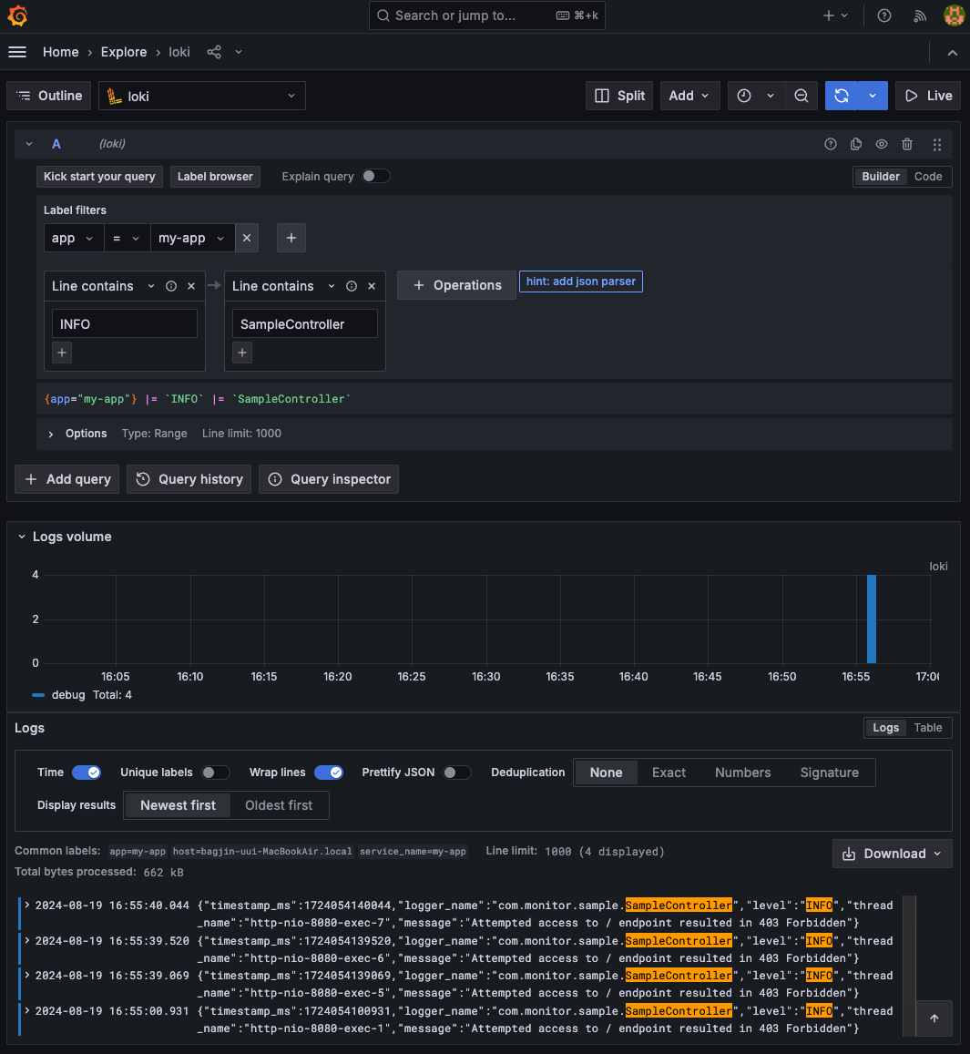 - 설정이 완료되면, Grafana 대시보드에서 Loki 앱을 사용하여 INFO와 SampleController 문자열을 포함하는 로그를 검색하고 시각화할 수 있습니다.