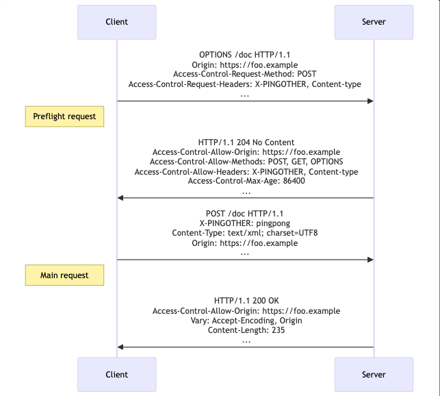 이러한 요청은 보안과 관련된 중요한 정보를 서버와 교환하는 경우가 많기 때문에, 추가적인 CORS 설정이 필요합니다.