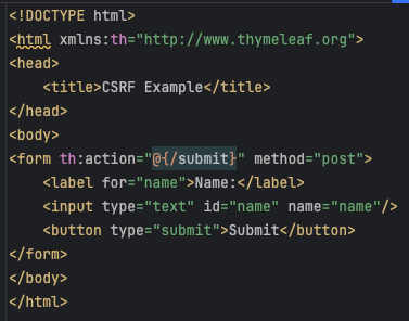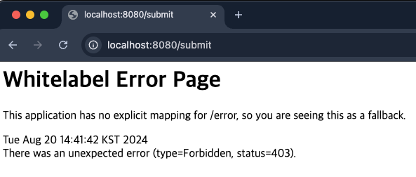 이 컨트롤러는 GET 요청으로 폼을 표시하고, POST 요청으로 폼 데이터를 처리합니다. @RequestParam을 사용하여 CSRF 토큰과 사용자 이름을 처리합니다.