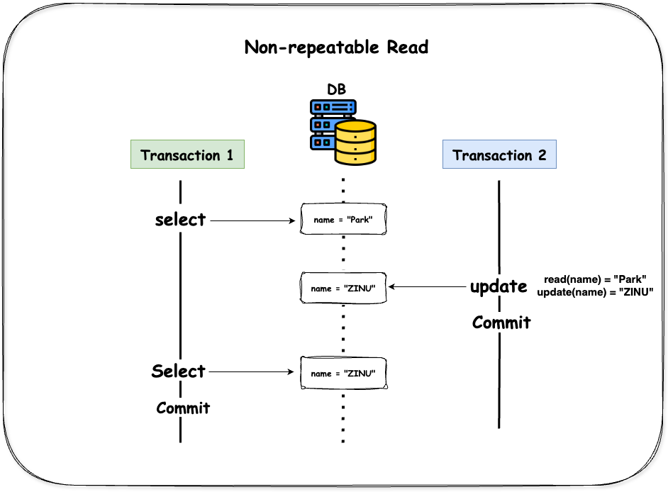 - 예를 들어 위와 같은 그림에서 트랜잭션 1이 처음 데이터를 읽었을 때("Park")와 나중에 같은 데이터를 다시 읽었을 때 값이 달라지는 상황이 발생할 수 있습니다.