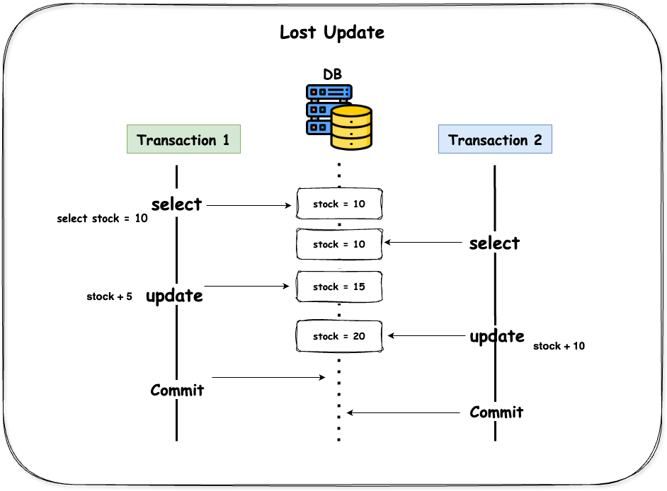- 예를 들어, 위와 같은 그림에서 트랜잭션 1의 수정 작업(10 -> 15)이 다른 트랜잭션 2의 업데이트에 의해 덮어씌워지면서 첫 번째 트랜잭션의 변경 내용(10 -> 20)이 유실되는 현상이 발생할 수 있습니다.