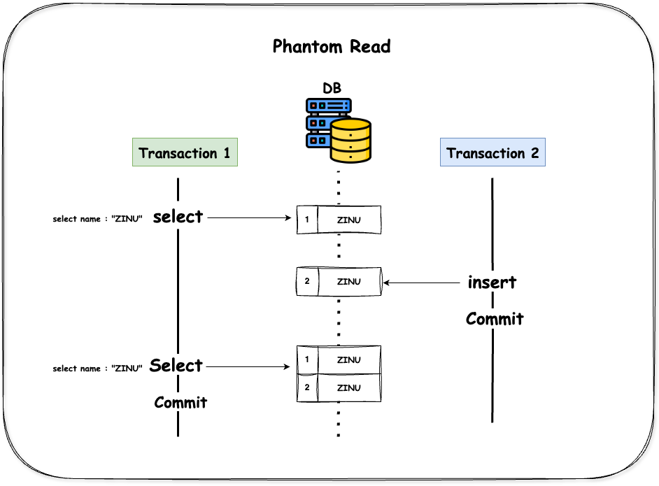 - 예를 들어, 위와 같은 그림에서 첫 번째 조회에서 특정 조건(name = "ZINU" )을 만족하는 레코드가 1개였지만, 두 번째 조회에서는 2개가 될 수 있습니다.