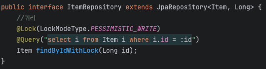 ItemRepository 인터페이스에서는 @Lock 어노테이션을 사용하여 LockModeType.PESSIMISTIC_WRITE 모드를 지정하고, findByIdWithLock 메서드를 통해 데이터를 조회할 때 해당 데이터에 쓰기 잠금을 적용합니다.
