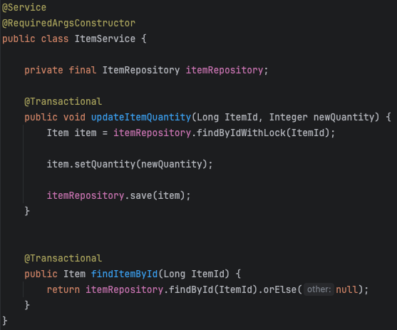 - findByIdWithLock 메소드를 호출하면, 데이터베이스는 해당 Item 레코드를 읽으면서 쓰기 잠금을 설정합니다.(LockModeType.PESSIMISTIC_WRITE).