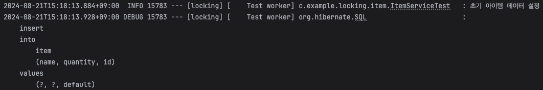 Item 객체를 생성하고 name을 "Item 1", quantity를 10으로 설정하여 데이터베이스에 저장하여 초기 데이터를 저장합니다. 위 로그를 보면 정상적으로 insert 쿼리문과 로그가 찍혔습니다.