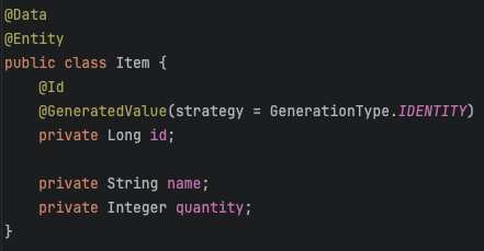 Item 엔티티는 id, name, quantity라는 세 가지 필드를 가진 간단한 JPA 엔티티입니다.