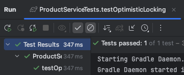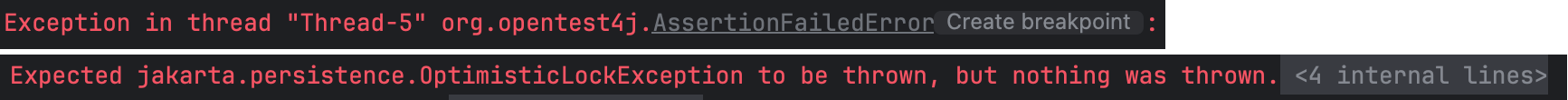 이후 스레드 2번이 수정된 엔티티를 다시 수정하려고 할 때, 버전이 맞지 않아 충돌이 발생하게 되고, 이로 인해 스레드 2는 업데이트에 실패하고, ObjectOptimisticLockingFailureException이 발생합니다. 이 예외는 assertThrows로 예상한 대로 발생하여 테스트가 정상적으로 통과합니다.