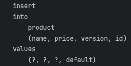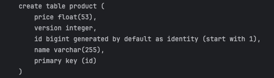 테스트를 위해 Hibernate가 product 테이블을 생성합니다. 이 테이블에는 price, version, id, name 필드가 있습니다. version 필드는 낙관적 락을 관리하는 데 사용됩니다.