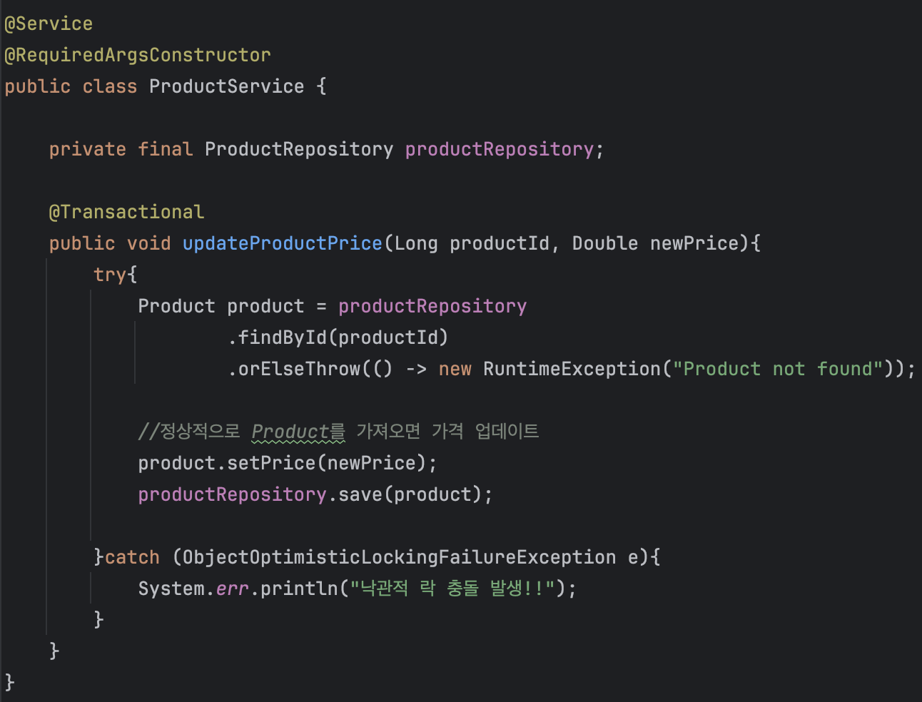 - 이 메서드는 @Transactional 어노테이션으로 트랜잭션 내에서 실행되며, 동시성 문제를 처리하기 위해 ObjectOptimisticLockingFailureException을 캐치(catch)합니다.