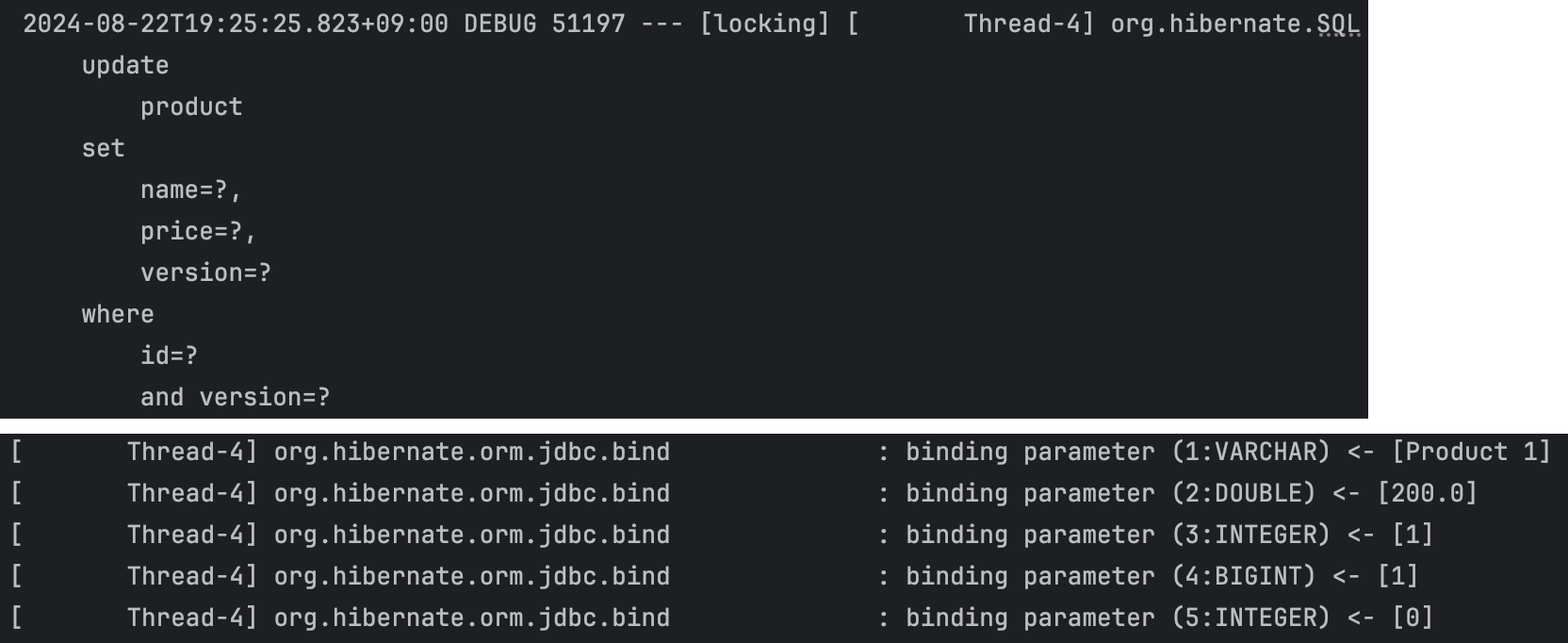 위 로그를 보면 스레드 1은 Product 엔티티의 가격을 200으로 업데이트합니다. 이때 version 값이 0에서 1로 증가합니다.