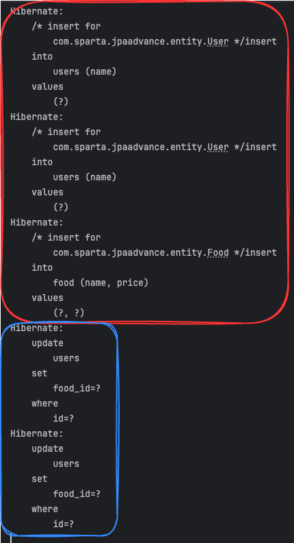 따라서, User가 삽입된 후, 외래 키의 주인인 Food 엔티티가 User 테이블에 대해 UPDATE 쿼리를 실행하여 FK를 등록(수정)하는 방식으로 처리됩니다.