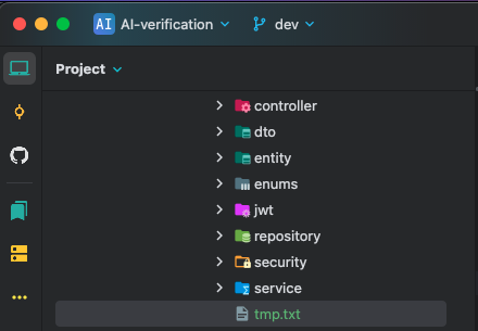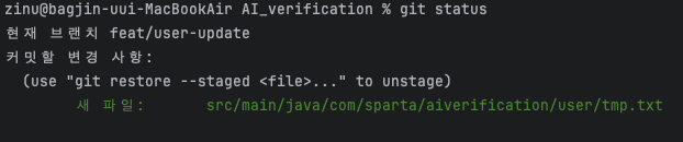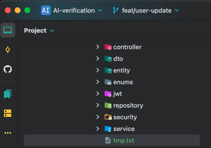 그래서 현재 브랜치가 제대로 적용되었는지 확인하기 위해 feat/user-update 브랜치에서 임시로 tmp.txt 파일을 만들었습니다. 그 후 브랜치를 전환하여 파일들이 사라지는지 확인하기로 했습니다.