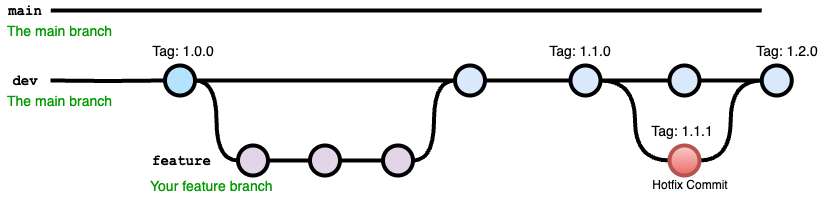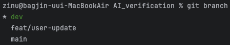 현재 팀의 기본 브랜치는 dev입니다. 새로운 기능을 개발하기 위해 feat/user-update라는 브랜치를 생성하고, 이 브랜치에서 dev 브랜치를 병합했습니다.