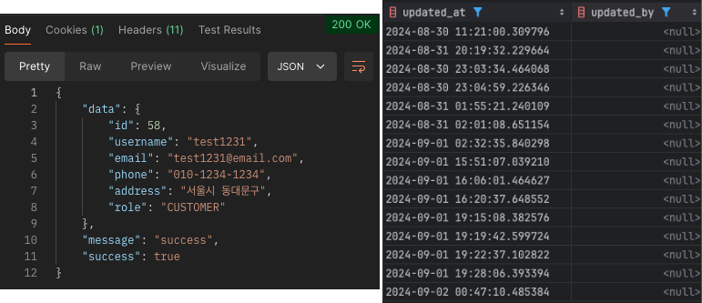 - 수정된 회원가입 로직을 테스트하여 createBy 필드가 올바르게 설정되는지 확인합니다. 3번의 그림에서 확인할 수 있듯이 createdBy필드가 정상적으로 저장되고 있도록 수정이 완료되었습니다.