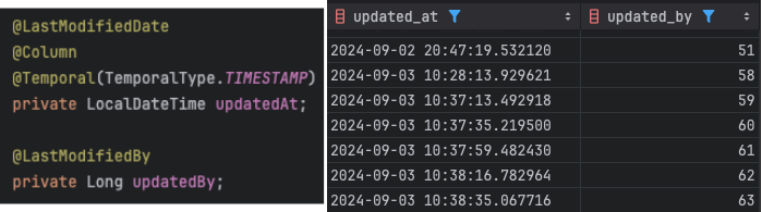 초기 계획에서는 updateBy와 deleteBy 필드에 대해 @Column(updatable = false)를 설정했으나, 계획 변경과 팀원의 코드 수정 과정에서 rebase 시 실수로 이 설정이 제거되지 않았습니다. 이로 인해 필드 값이 자동으로 업데이트되지 않았습니다.