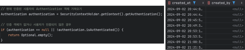 - createBy필드를 설정하기 위해 UserAuditorAware에 의존하는 설계에서 인증된 사용자가 없는 경우를 고려하지 못했습니다.