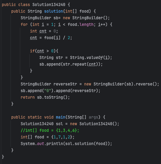 StringBuilder의 reverse() 메서드는 문자열을 간편하게 역순으로 만드는 메서드입니다. 따라서 저는 위 코드와 같이 음식의 개수를 2로 나누고, 몫만큼 반복하는 구조로 작성했습니다.