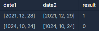 - date1과 date2는 날짜가 서로 같으므로 date1이 더 앞서는 날짜가 아닙니다. 따라서 0을 return 합니다.