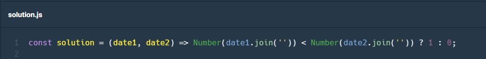 그다음 비교 연산자 < 를 사용하여 date1이 더 작다면 date1이 앞선 날짜이기 때문에 삼항연산자를 사용하여 1과 0을 return 해주었습니다.