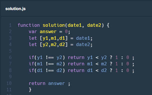 ▶구조 분해 할당 포스팅에서 알아본 것처럼 주어진 date1, date2 배열을 구조 분해 할당을 이용하여 각 변수에 저장해 주고 각 Year, Month, Day 가 같지 않으면 바로 비교가 가능하기 때문에 삼항 연산자를 사용하여 answer 값을 return 해주었습니다.