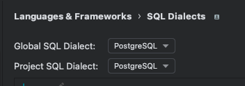 Settings 창을 열고, 좌측메뉴 Languages & Frameworks > SQL Dialects 메뉴에서 사용중은 Database를 지정해주면됩니다.