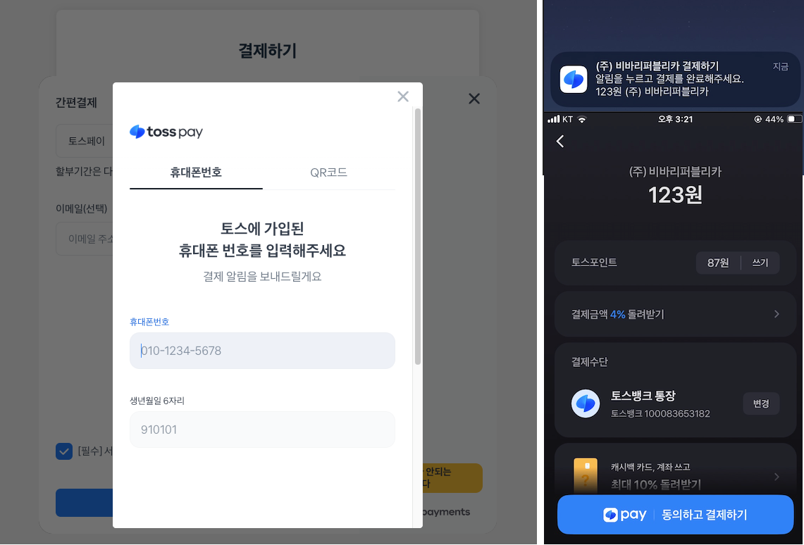 위와 같이 결제 요청을 한다면 결제 알람이 오고, [동의하고 결제하기]를 클릭하면 최종적으로 결제가 이루어집니다. 이 때, 여러 이유로 결제가 거부되면 실패 콜백 URL로 리다이렉트 되고, 결제가 성공하면 성공 콜백 URL로 필요한 파라미터가 담겨서 리다이렉트 됩니다.