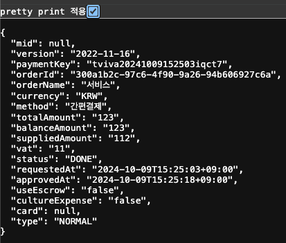 이와 같이 인코딩된 값을 Basic 인증 헤더에 넣고 요청 본문을 추가하여 최종 결제승인을 토스페이먼츠에 요구하게되면 앞서 설명했듯이 결제정보를 JSON형태로 받게 됩니다.