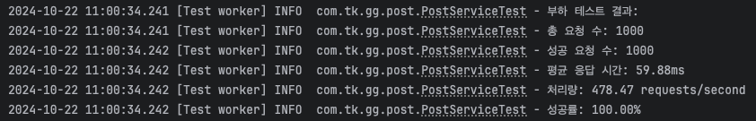 2024-10-22 11:00:34.241 [Test worker] INFO com.tk.gg.post.PostServiceTest - 부하 테스트 결과: