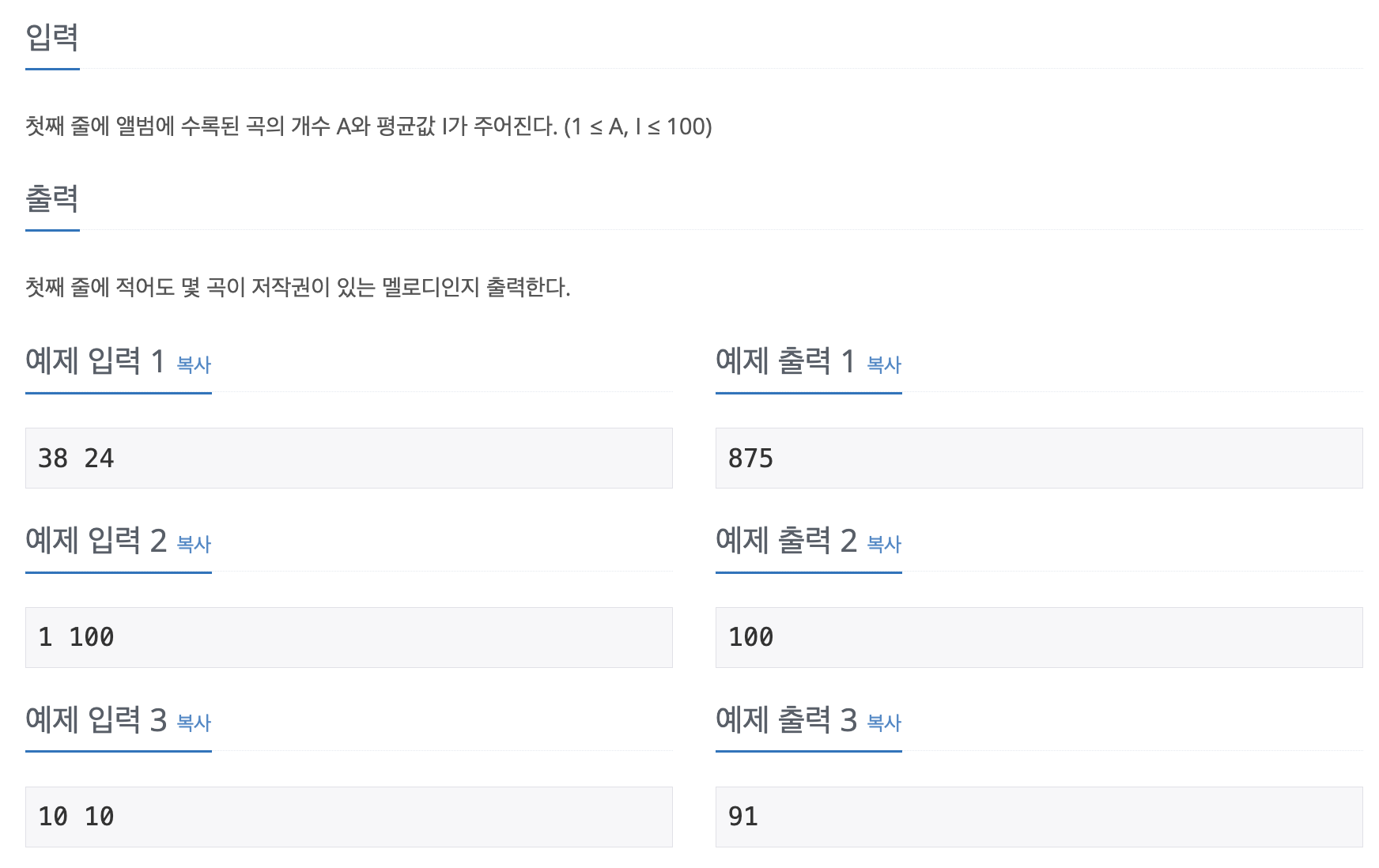 이번 문제는 첫째 줄에 앨범에 수록된 곡의 개수 A와 평균값 I가 주어질 때 적어도 몇 곡이 저작권이 있는 멜로디인지 출력하는 문제입니다.