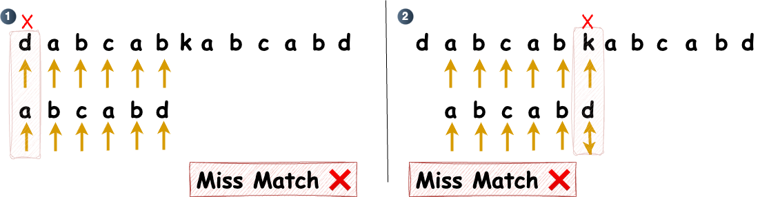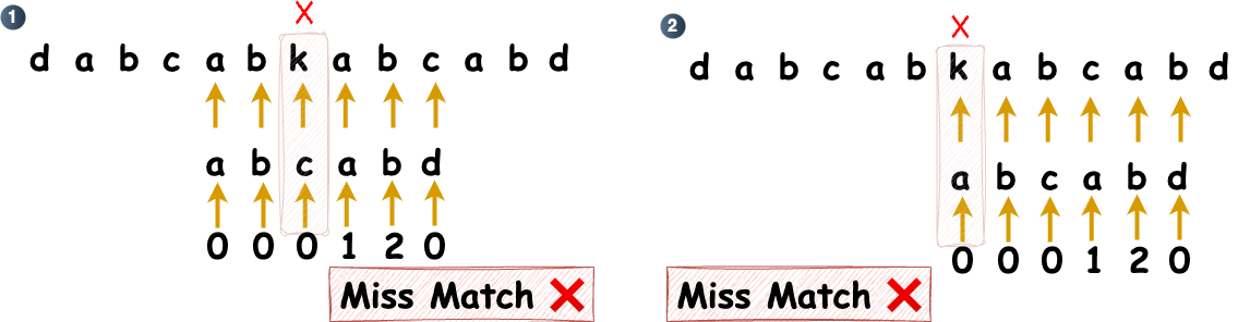 첫 번째 비교부터 Miss Match가 일어나기 때문에 다음 인덱스와 비교를 해줍니다. 계속 매칭되다가 마지막에 k ↔️ d일 때 Miss Match가 일어납니다.