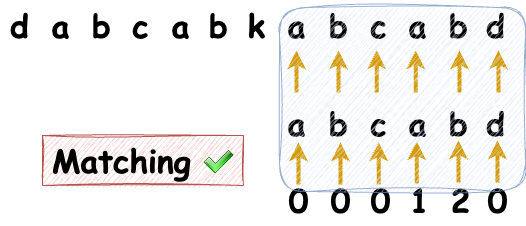 그러면 또 다른 예제에서 확인해보겠습니다. 1번째 문자열이 "d a b c a b k a b c a b d" 이고, 2번째 문자열이 "a b c a b d" 일 경우를 확인해보겠습니다.