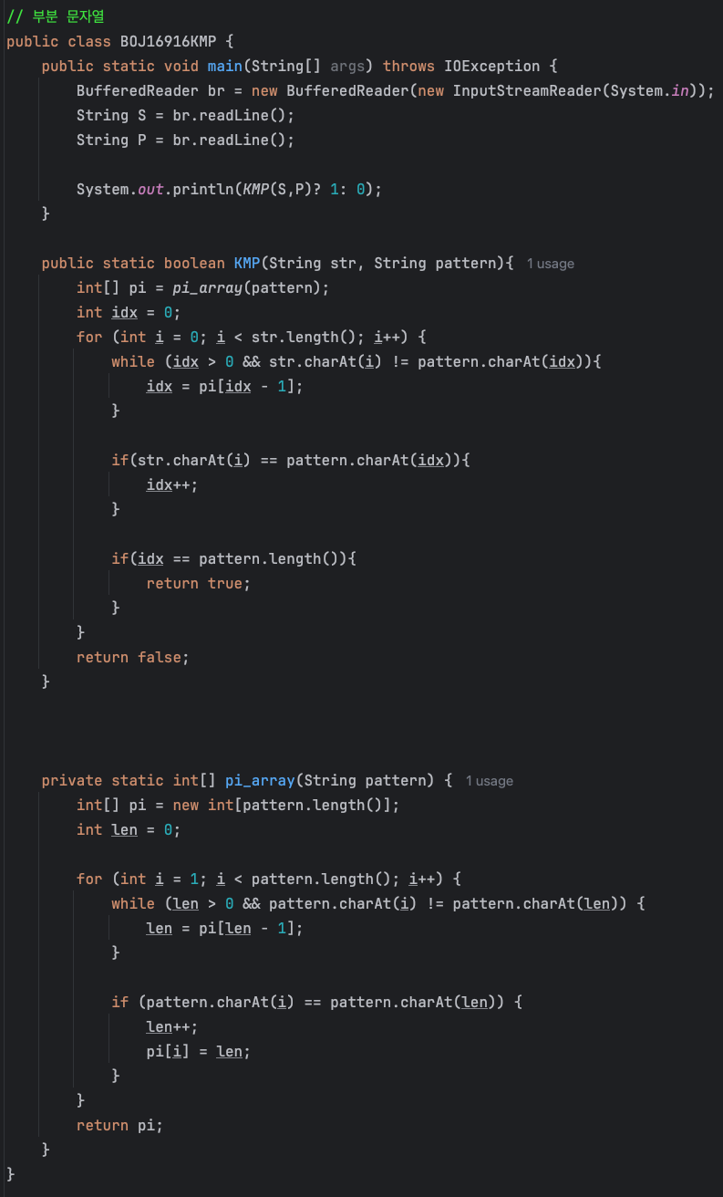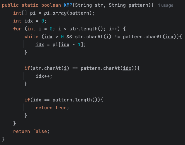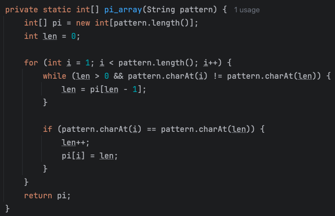 - pi_array 메서드를 통해 pattern의 pi 배열을 미리 계산해 중복되는 접두사와 접미사를 처리할 준비를 합니다.