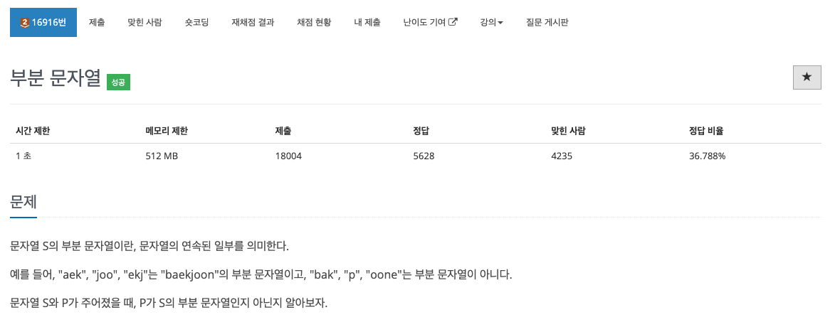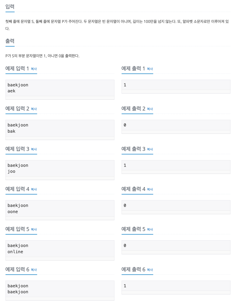 이번 문제는 문자열 2개가 주어졌을 때 P가 S의 부분 문자열이면 1, 아니면 0을 출력하는 간단한 문제입니다.