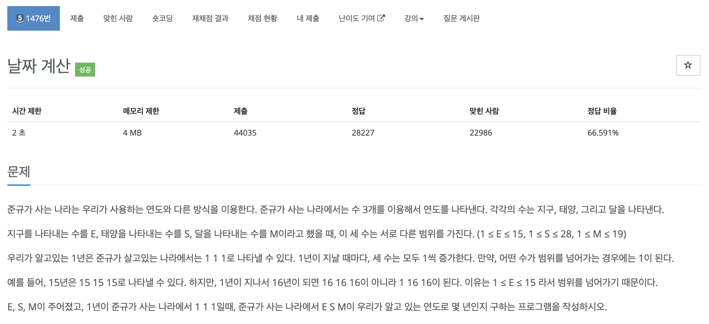 이번 "백준 - 날짜 계산" 문제는 (E, S, M)이 각각 주어진 값으로 표현되는 연도를 구하는 것이 문제입니다.