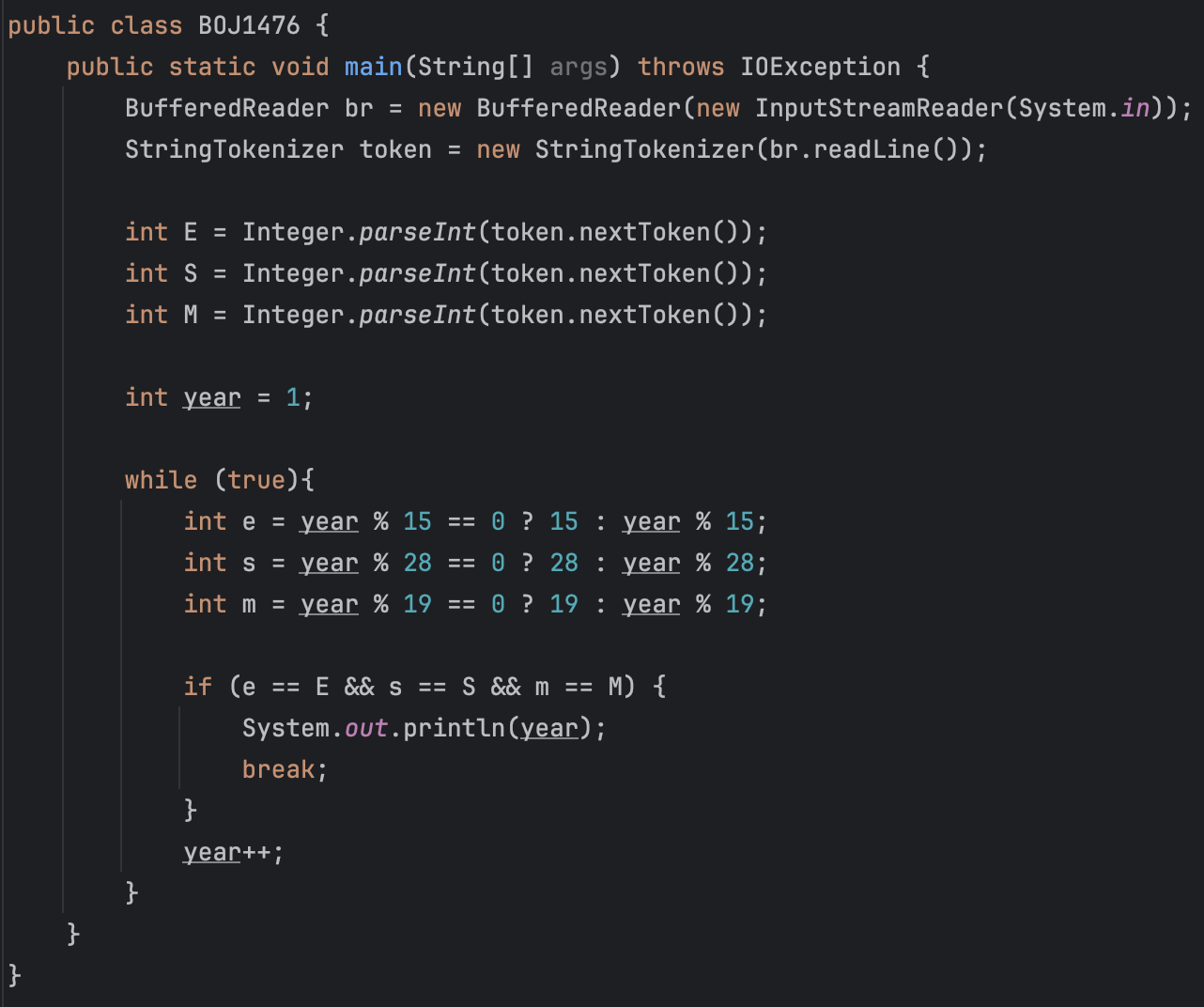 - 주어진 값 E, S, M과 계산된 e, s, m이 모두 일치하면, 현재 연도(year)를 출력하고 반복문을 종료합니다.