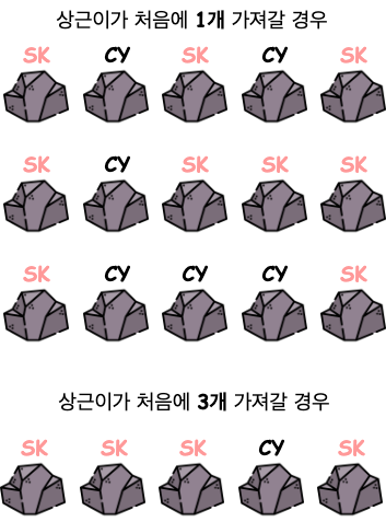 - 상근이와 창영이가 번갈아 가며 돌을 가져간다.