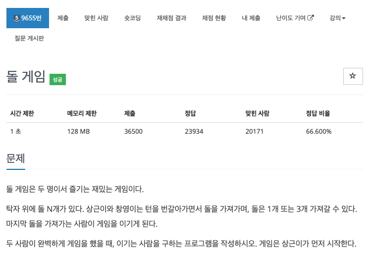 이번 "백준 - 돌 게임"문제는 2명의 플레이어(상근,창영)가 돌을 1개 또는 3개 가져갈 때 마지막 돌을 가져가는 사람이 승자하는 게임입니다.
