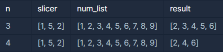 - n = 4 : num_list의 a번 인덱스부터 b번 인덱스까지 c 간격으로